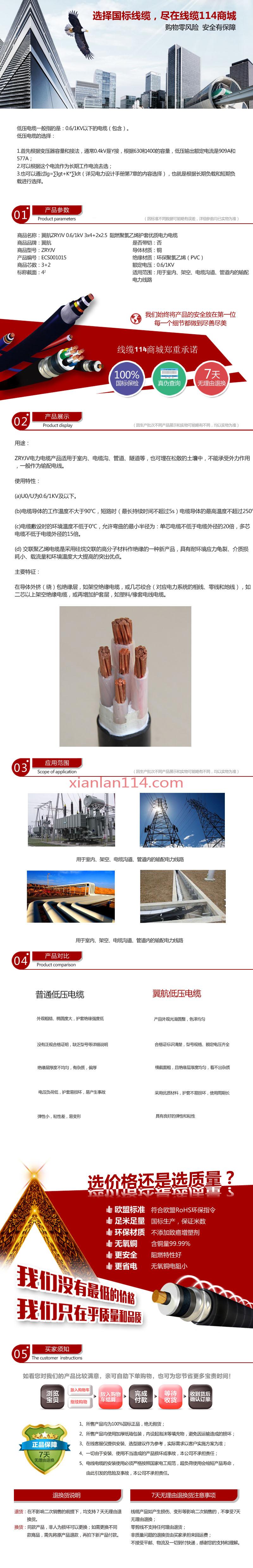 - 商品名称:翼航线缆厂家直销 ZRYJV 0.6/1kV 3x4+2x2.5优质电缆阻燃交联聚乙烯绝缘3+2芯聚氯乙烯护套电力电缆国标正品