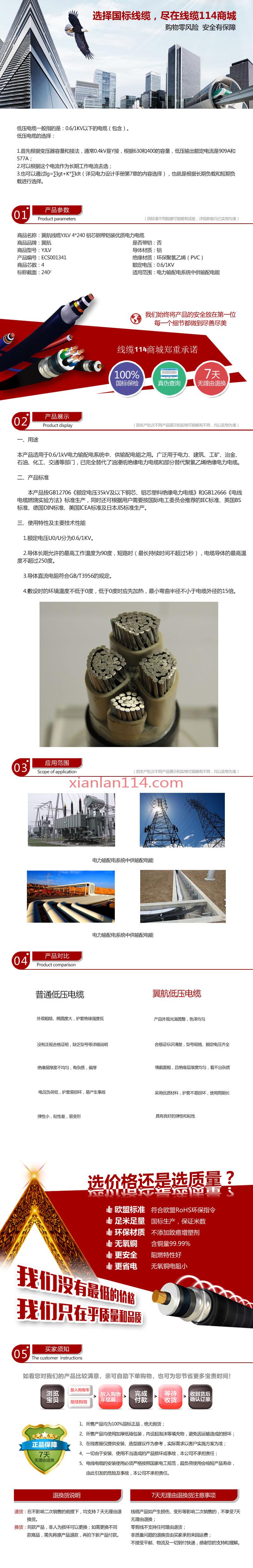 - 商品名称: 翼航线缆国标正品YJLV 0.6/1kV 4x240交联聚乙烯绝缘铝芯聚氯乙烯护套电力优质电缆厂家直销