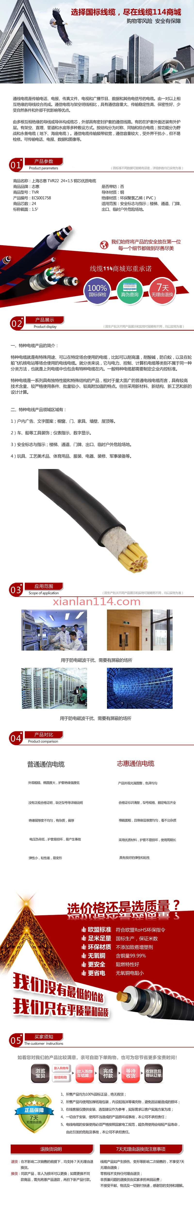 商品属性 [截面] 1.5² [芯数] 24 [是否带铠] 是 [材质] 铜 [电压] 25-50V [电流] 7000-12000A [用途] 户内广告、文字图案;橱窗、门、家具、墙壁、屋顶等。 [型号] TVR22 24×1.5 [数量单位] 米