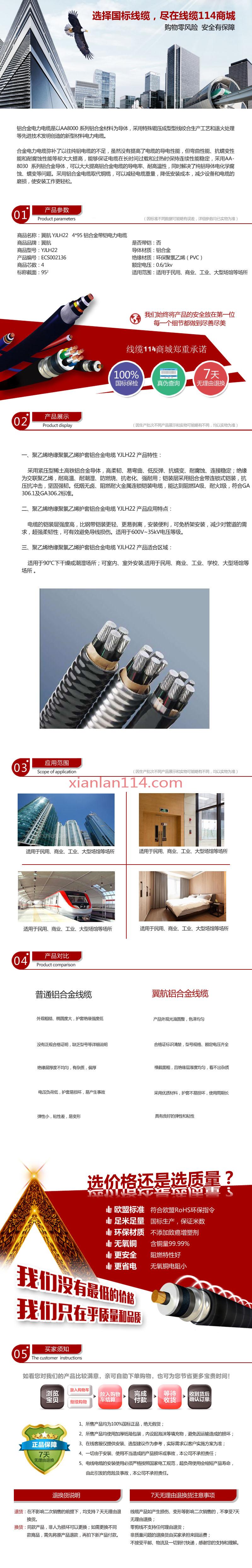 商品属性 [截面] 95² [芯数] 4 [是否带铠] 是 [材质] 铝 [电压] 0.6/1KV [用途] 适合用于普通民宅、高层建筑、电梯、大小型超市商场、地铁、机场、车站、医院、银行、写字楼、宾馆酒店、邮政电信大楼、展览馆、图书馆、博物馆、古代建筑、学校、电力大楼、公共娱乐场所、隧道、地下建筑等 [型号] YJLH22 [数量单位] 米
