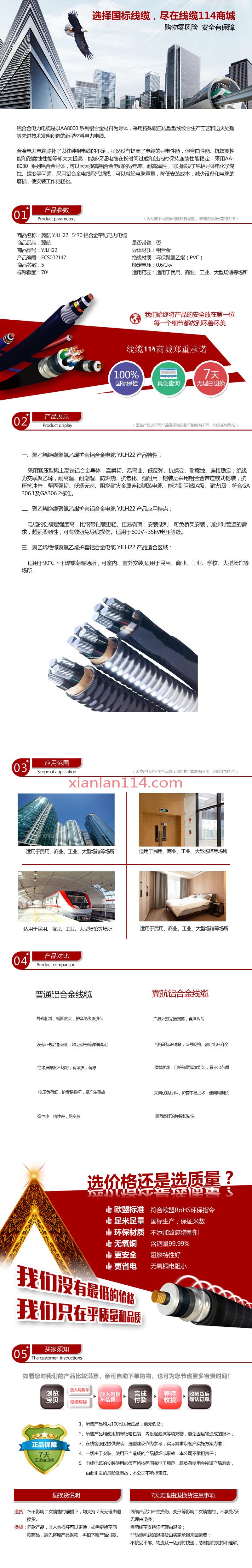 商品属性 [截面] 70² [芯数] 5 [是否带铠] 是 [材质] 铝 [电压] 0.6/1KV [用途] 适合用于普通民宅、高层建筑、电梯、大小型超市商场、地铁、机场、车站、医院、银行、写字楼、宾馆酒店、邮政电信大楼、展览馆、图书馆、博物馆、古代建筑、学校、电力大楼、公共娱乐场所、隧道、地下建筑等 [型号] YJLH22 [数量单位] 米