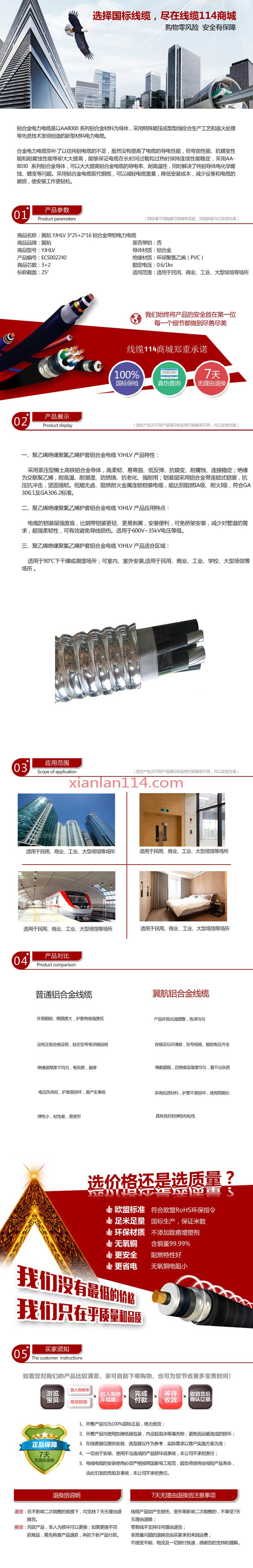商品属性 [截面] 25² [芯数] 3+2 [是否带铠] 否 [材质] 铝 [电压] 0.6/1KV [用途] 适用于民用、商业、工业、学校、大型场馆等场所 [型号] YJHLV [数量单位] 米