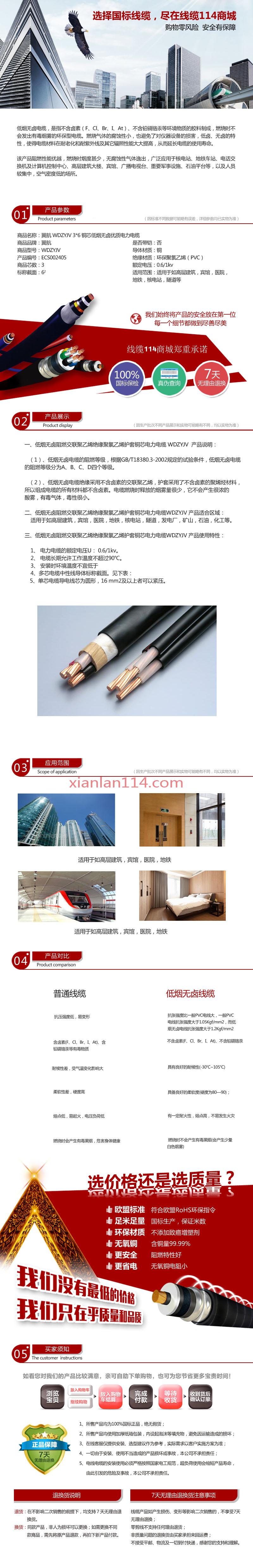 商品属性 [截面] 6² [芯数] 3 [是否带铠] 否 [材质] 铜 [电压] 0.6/1kv [用途] 适用于如高层建筑,宾馆,医院,地铁,核电站,隧道等 [型号] WDZYJV [数量单位] 米