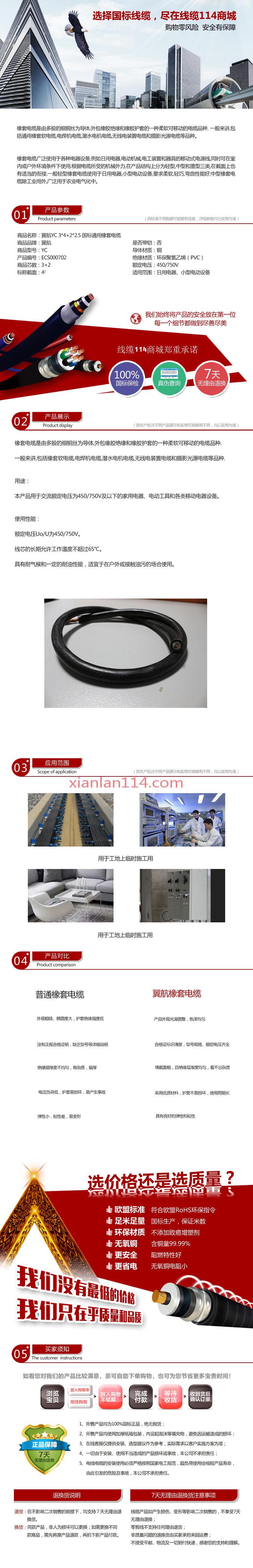 - 商品名称:供应翼航线缆YC 3*4+2*2.5 国标铜芯重型通用橡套电缆 足方足米
